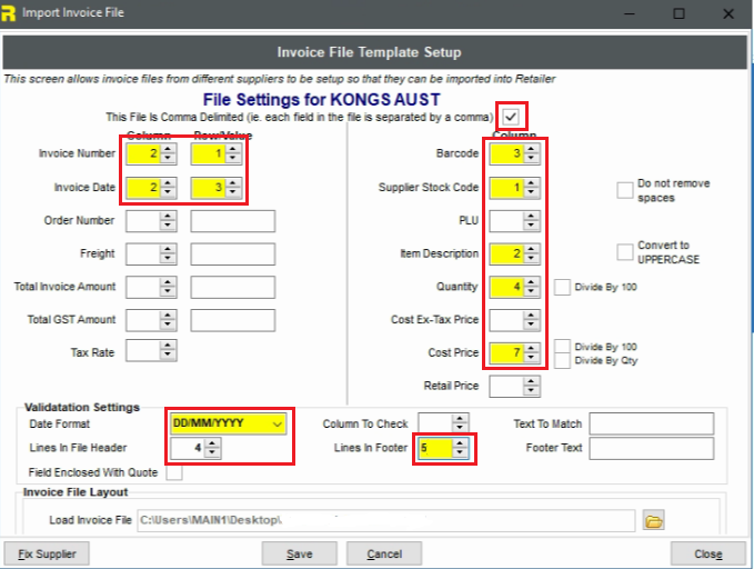 The settings will need to be configured from the bottom-up. The settings on this screen will direct Retailer to use the appropriate information from the file.